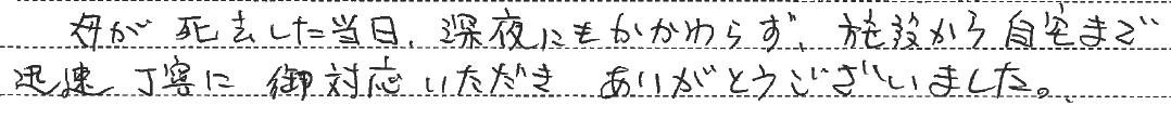 母が死去した当日、深夜にもかかわらず、施設から自宅まで迅速丁寧に御対応いただきありがとうございました